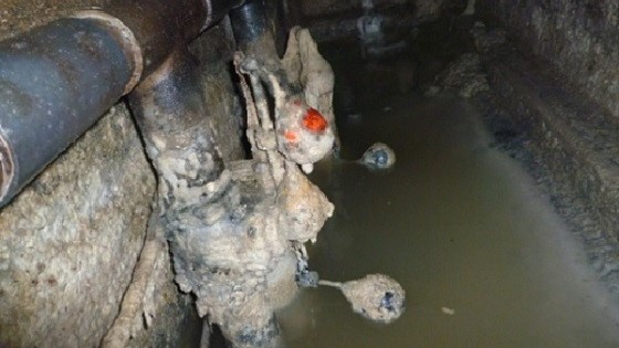 原因を調査すると、そばのゆで汁がポンプにまとわりつくように汚れが付き、ポンプの起動を妨げていました。今までは排水が溢れると水道屋さんにて排水槽を簡易的に洗浄していましたが、水道屋さんでは汚泥の吸引は出来ず、排水ポンプの掃除をしていなかった為、頻繁に詰まっていました。